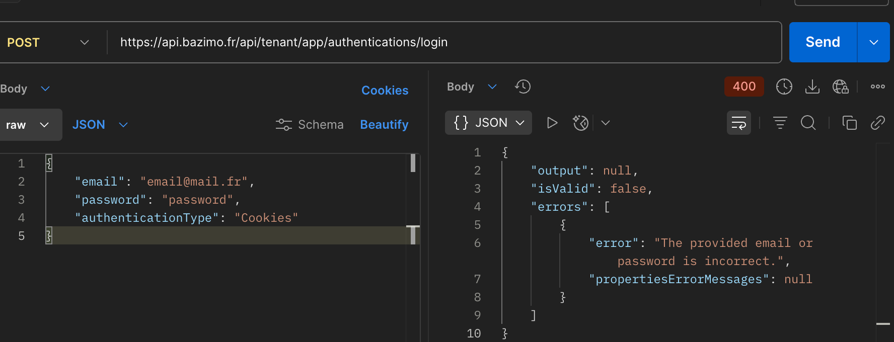 Il faut ensuite renseigner le body avec ces données comme ceci : { "email": "email@mail.fr", "password": "password", "authenticationType": "Cookies" }