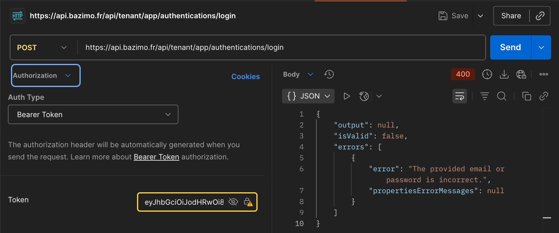 Exemple de login avec Postman : Il faut renseigner le Bearer Token dans Authorization -> Auth Type = Bearer Token -> Renseigner le token